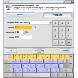 Wenn Sie LS-POS mit einem Touchscreen benutzen möchten, benötigen Sie dieses Modul. Alle Eingabedialoge werden dann für den Betrieb mit virtueller Tastatur bzw. Ziffernblock erweitert. Eine virtuelle Tastatur bzw. ein Ziffernblock werden eingeblendet.